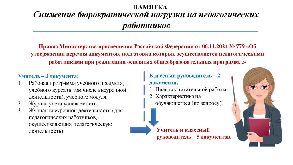 - Приказ Министерства просвещения Российской Федерации от 06.11.2024 № 779 «Об утверждении перечня документов, подготовка которых осуществляется педагогическими работниками при реализации основных общеобразовательных программ»